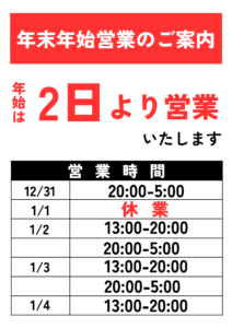 年末年始も、元旦以外営業します☺️ 今年もあっという間に年末ですね。当店は年末年始も元旦以外ほぼ通常通り営業します。年明け2、3日は昼も夜もコミュニティ営業というスタイルを取らせて頂きます 「年末年始、どこ行こうかな〜」 […]