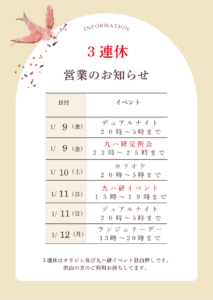⭐︎3連休の営業時間・イベントのお知らせ⭐︎ 3連休の営業時間および開催イベントは、下記の通りです。 オリジンイベント、九ハ研イベントなど、楽しい企画が盛りだくさんとなっています✨ ぜひお気軽に遊びに来てください。